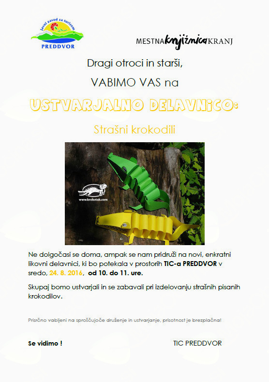 Ustvarjalci in ustvarjalke, vabljeni na novo avgustovsko ustvarjalno delavnico, na kateri bomo izdelovali strašne krokodile vseh mogočih barv. Delavnica bo potekala v sredo, 24. 8. 2016, od 10.00 do 11.00 v TICu Preddvor.