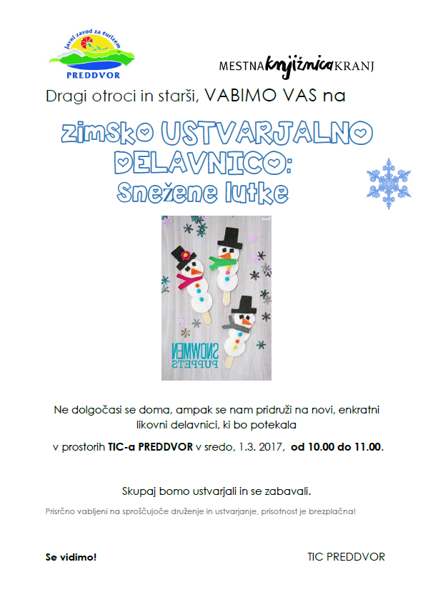 v prostorih TIC-a PREDDVOR v sredo, 1.3. 2017, od 10.00 do 11.00.
