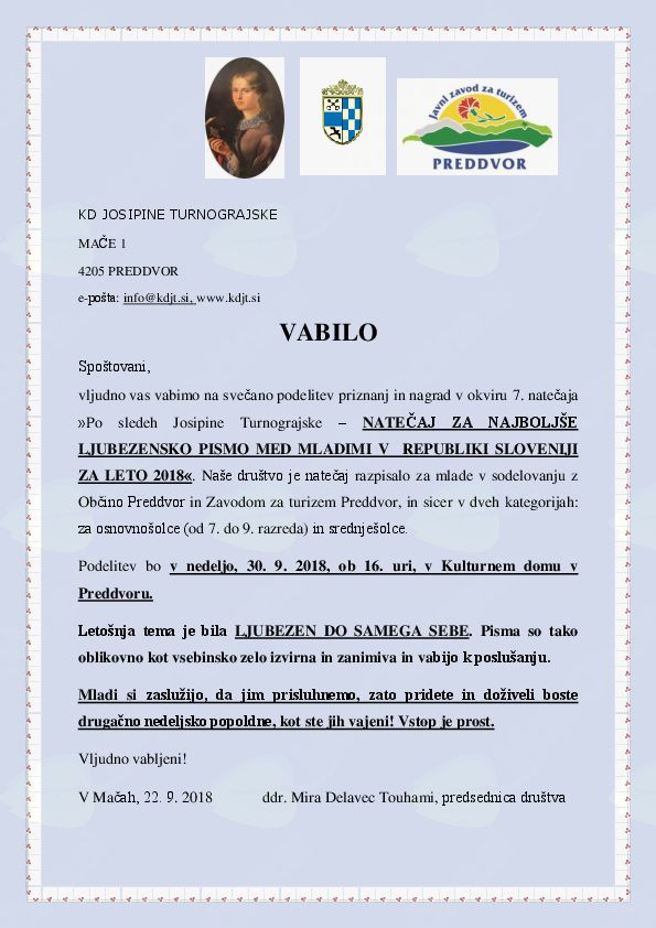 vljudno vas vabimo na svečano podelitev priznanj in nagrad v okviru 7. natečaja »Po sledeh Josipine Turnograjske – NATEČAJ ZA NAJBOLJŠE LJUBEZENSKO PISMO MED MLADIMI V REPUBLIKI SLOVENIJI ZA LETO 2018«. Naše društvo je natečaj razpisalo za mlade v sodelovanju z Občino Preddvor in Zavodom za turizem Preddvor, in sicer v dveh kategorijah: za osnovnošolce (od 7. do 9. razreda) in srednješolce.