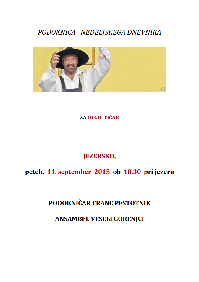 V petek, 11. septembra 2015 ob 18:30 uri, bo na Jezerskem potekala podoknica za Olgo Tičar.