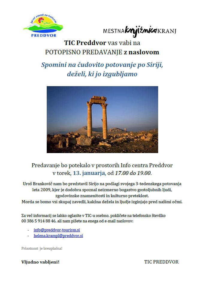 TIC Preddvor vas vabi na POTOPISNO PREDAVANJE z naslovom - Spomini na čudovito potovanje po Siriji, deželi, ki jo izgubljamo.