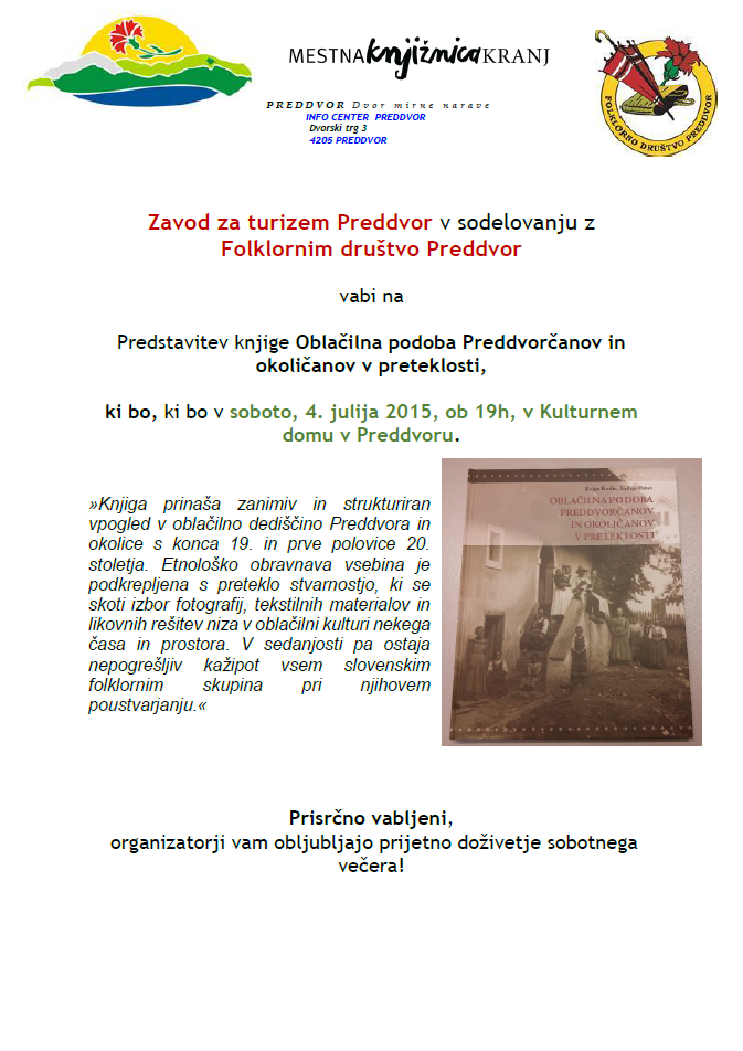 Zavod za turizem Preddvor v sodelovanju z Folklornim društvo Preddvor vabi na predstavitev knjige