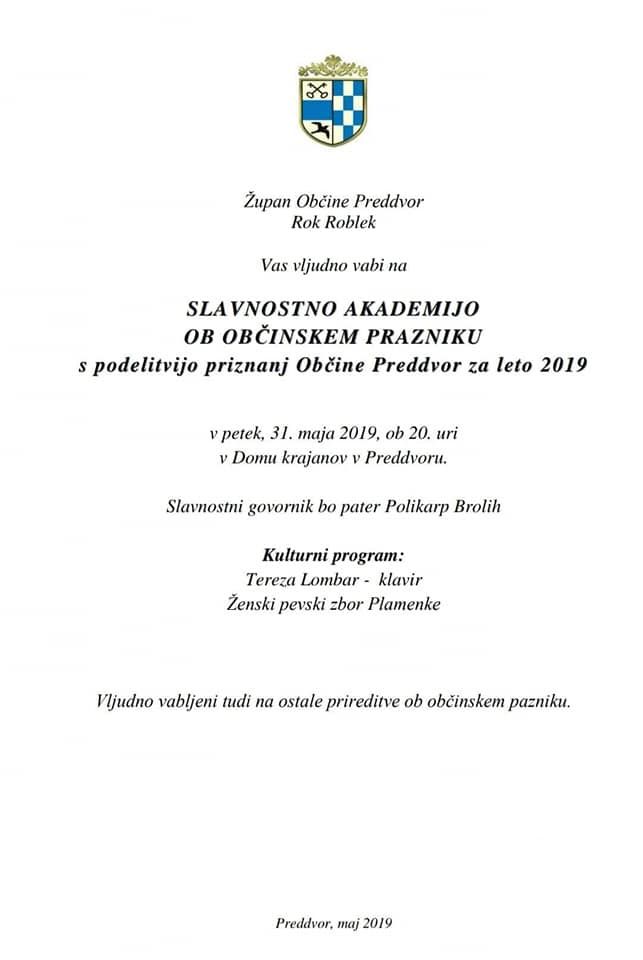Na letošnji slavnostni akademiji ob občinskem prazniku bo zbrane najprej nagovoril župan Rok Roblek, ki bo podelil občinsko priznanje dolgoletnemu predsedniku Rdečega križa v Bašlju Miru Robleku. Osrednji govornik bo pater Polikarp Brolih, v kulturnem programu pa bosta nastopili Ženska vokalna skupina Plamenke in pianistka Tereza Lombar, učenka OŠ Matije Valjavca Preddvor in Glasbene šole Kranj.