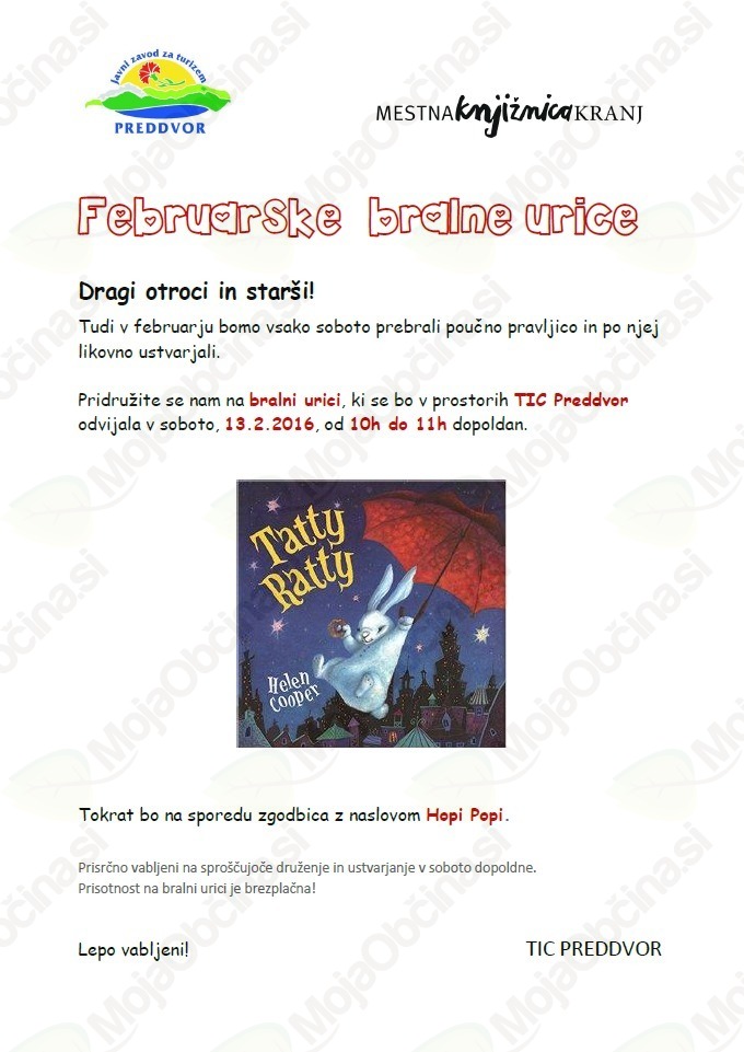V soboto, 13.2.2016, bo na sporedu zgodbica z naslovom Hopi Popi. Pridružite se nam v prostorih TIC Preddvor, ustvarjali bomo od 10. do 11. ure.