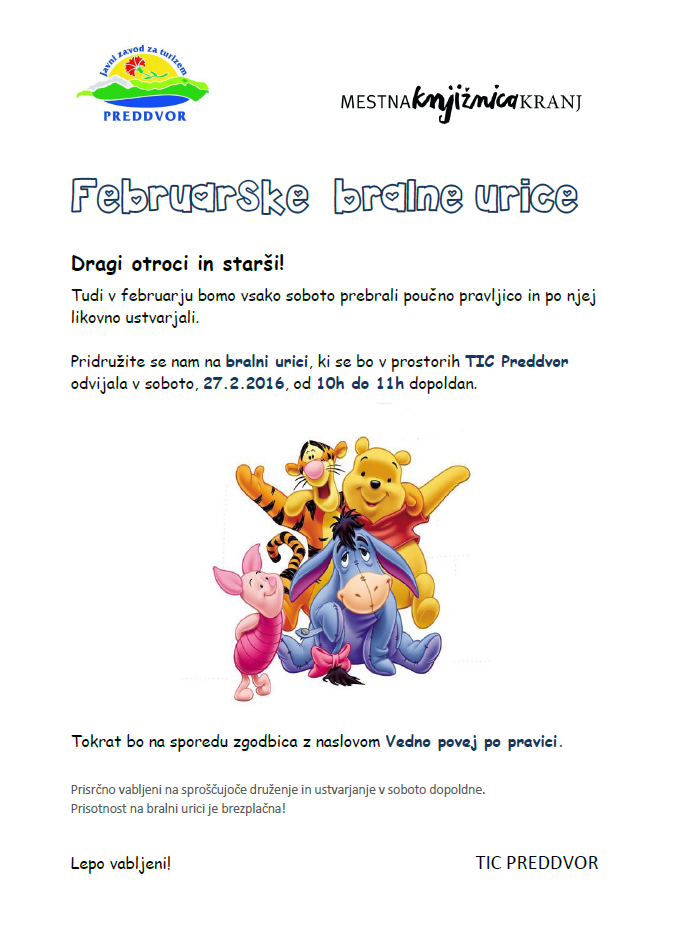Pridružite se nam na bralni urici, ki se bo v prostorih TIC Preddvor odvijala v soboto, 27.2.2016, od 10h do 11h dopoldan.