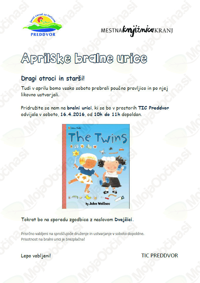 Pridružite se nam na bralni urici, ki se bo v prostorih TIC Preddvor odvijala v soboto, 16. 4. 2016, od 10h do 11h dopoldan.