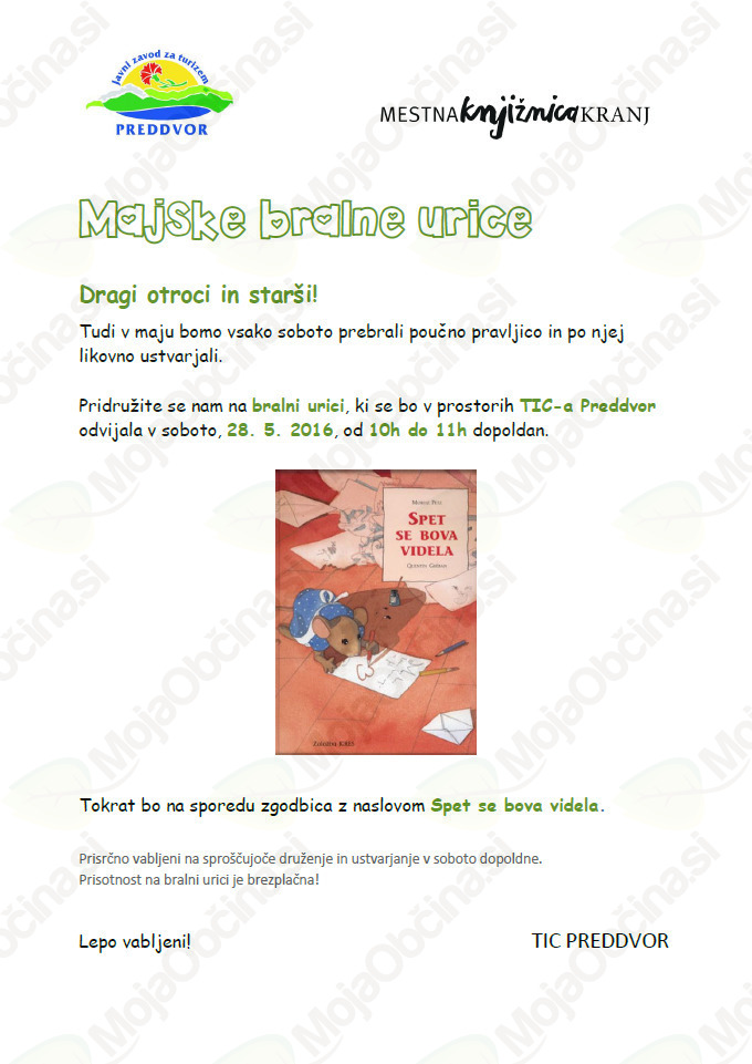 Pridružite se nam na bralni urici, ki se bo v prostorih TIC-a Preddvor odvijala v soboto, 28. 5. 2016, od 10h do 11h dopoldan. Tokrat bo na sporedu zgodbica z naslovom Spet se bova videla.