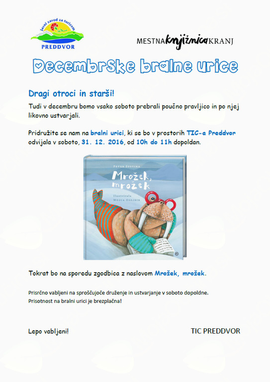 tudi na silvestrovo bomo pridni in vas vabimo na zares zadnjo decembrsko bralno urico leta 2016. Pridite, super bo! Družili se bomo od 10.00 do 11.00, udeležba je brezplačna.