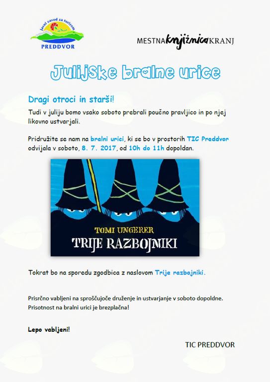 Pridružite se nam na bralni urici, ki se bo v prostorih TIC Preddvor odvijala v soboto, 8. 7. 2017, od 10h do 11h dopoldan.