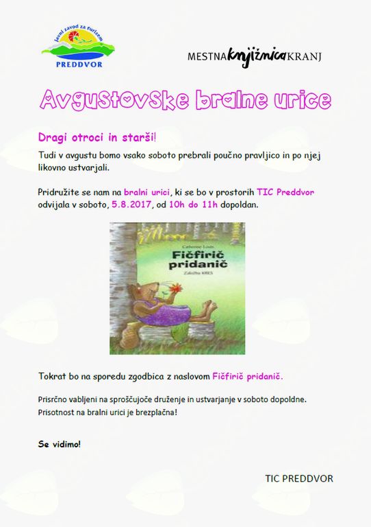 Pridružite se nam na bralni urici, ki se bo v prostorih TIC Preddvor odvijala v soboto, 5.8.2017, od 10h do 11h dopoldan.