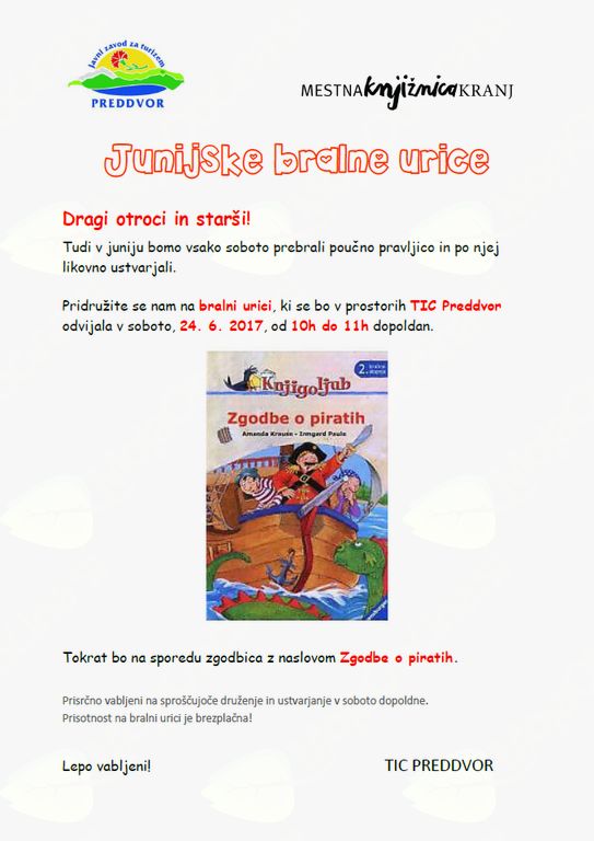 Pridružite se nam na bralni urici, ki se bo v prostorih TIC Preddvor odvijala v soboto, 24. 6. 2017, od 10h do 11h dopoldan.