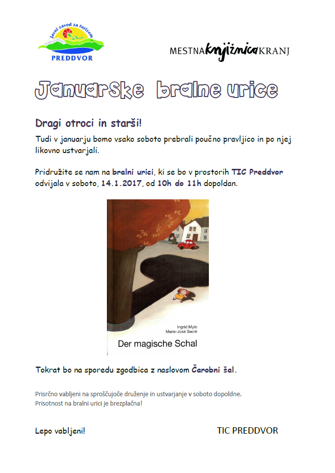 Pridružite se nam na bralni urici, ki se bo v prostorih TIC Preddvor odvijala v soboto, 14.1.2017, od 10h do 11h dopoldan.