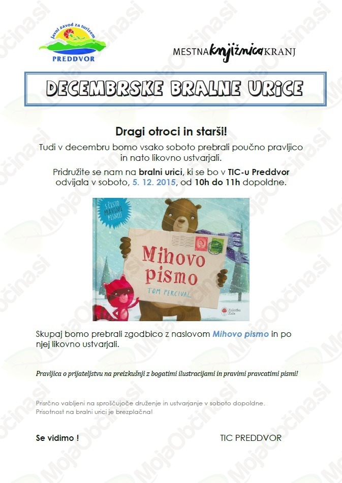 Pred vrati je že zadnji mesec v letu, december, in z njim v TIC Preddvor prihajajo tudi decembrske bralne urice. Odvijale se bodo vsako soboto od 10. 00 do 11. 00 v prostorih TIC-a. Lepo vabljeni na prijetno prebiranje čudovitih pravljic in ustvarjanje zanimivih motivov.