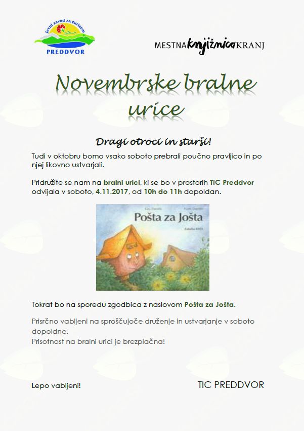 Pridružite se nam na bralni urici, ki se bo v prostorih TIC Preddvor odvijala v soboto, 4.11.2017, od 10h do 11h dopoldan.Tokrat bo na sporedu zgodbica z naslovom Pošta za Jošta.