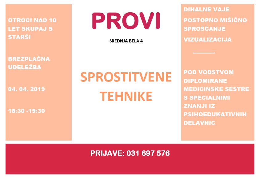 V Proviju na Srednji Beli bo v četrtek, 4. aprila 2019, ob 18.30 potekala vadba sprostitvenih tehnik za otroke nad 10 let in njihove starše. Pod vodstvom diplomirane medicinske sestre s specialnimi znanji iz psihoedukativnih delavnic boste izvedli dihalne vaje, vajo postopnega mišičnega sproščanja in vizualizacijo. Udeležba je brezplačna.