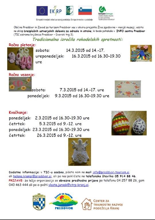 Občina Preddvor in Zavod za turizem Preddvor vas v okviru projekta Živa zgodovina – manjši muzeji, vabita na sklop brezplačnih ustvarjalnih delavnic za otroke in odrasle: