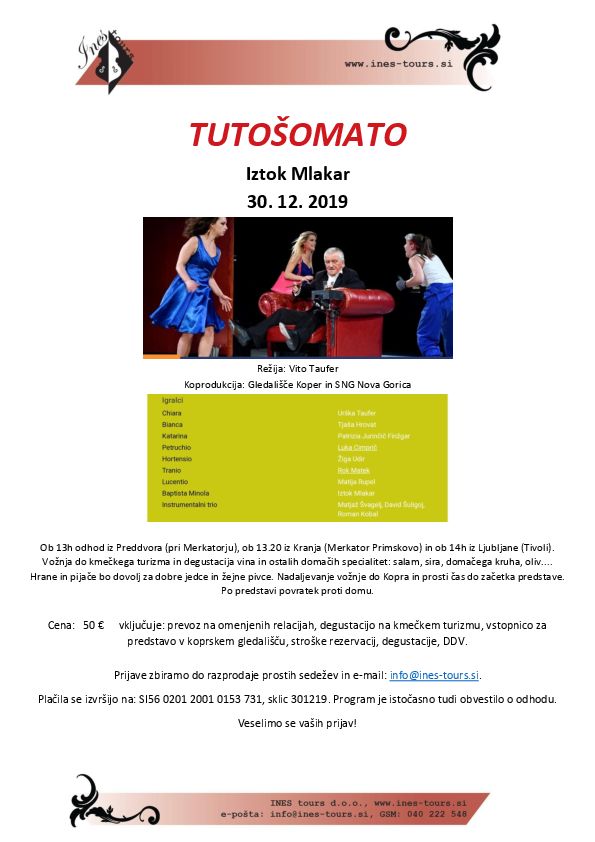 Ob 13h odhod iz Preddvora (pri Merkatorju), ob 13.20 iz Kranja (Merkator Primskovo) in ob 14h iz Ljubljane (Tivoli). Vožnja do kmečkega turizma in degustacija vina in ostalih domačih specialitet: salam, sira, domačega kruha, oliv.... Hrane in pijače bo dovolj za dobre jedce in žejne pivce. Nadaljevanje vožnje do Kopra in prosti čas do začetka predstave. Po predstavi povratek proti domu.