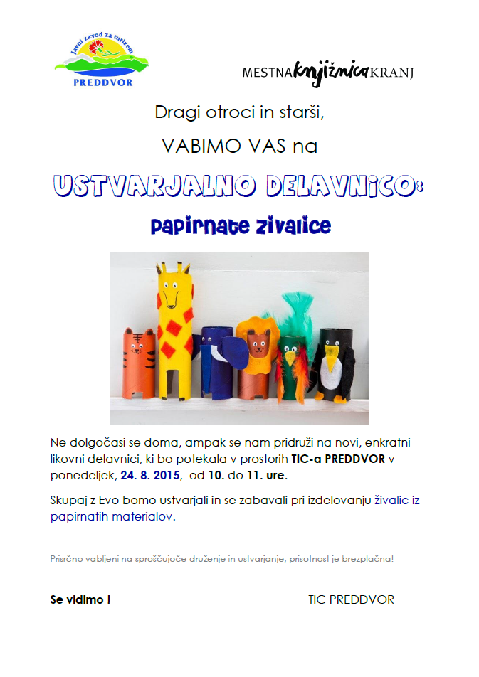 Dragi otroci in starši, na tokratni avgustovski ustvarjalni delavnici bomo izdelovali živalice iz papirnatih tulcev. Lepo vabljeni!