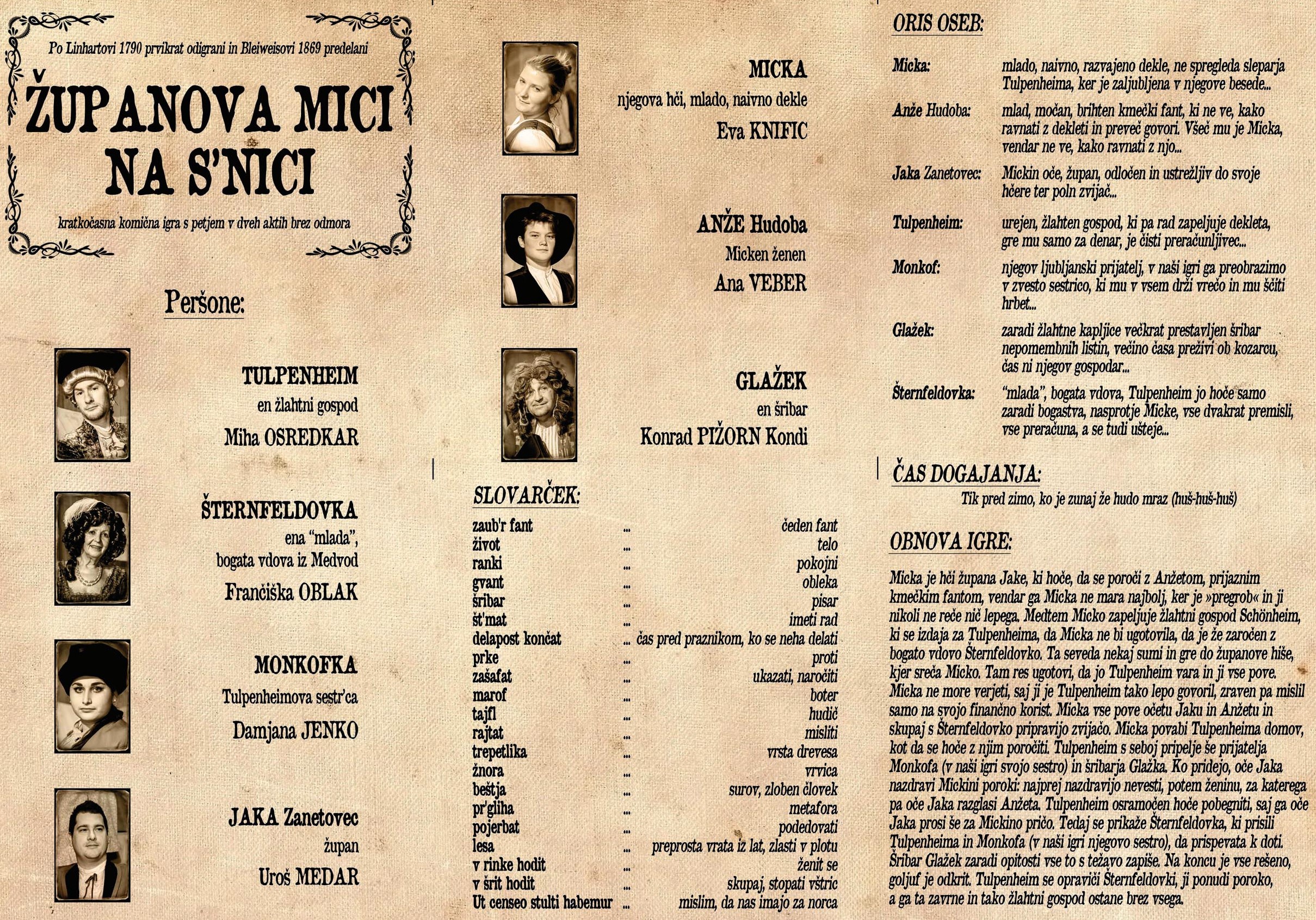 Vse skupaj boste z županom Jakom, zapeljano Micko in trdim Anžetom, ljubljanskim Tulpenheimom in njegovo sestro, katere obljubo bo gor šribal Glažek z gradu Turn, ki je 'breške kmete na kant spravil'.