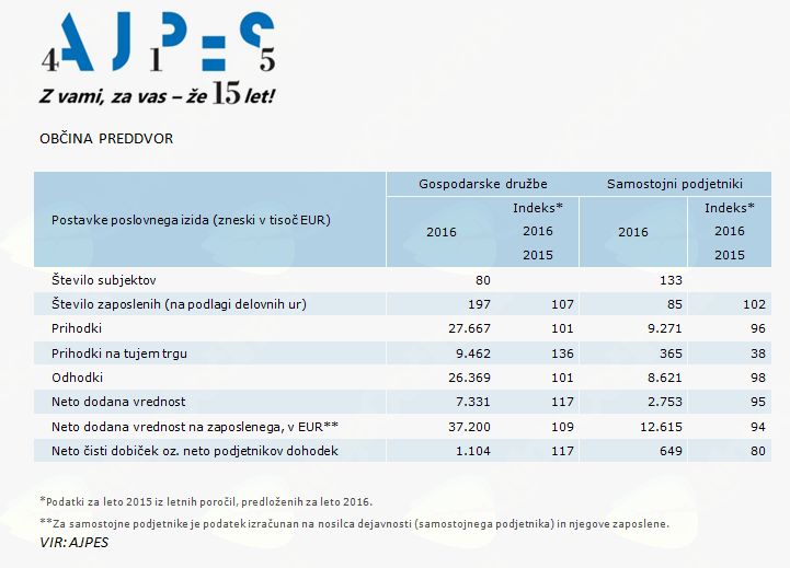 AJPES, Izpostavi Kranj, je podatke iz letnih poročil za namen državne statistike predložilo 80 gospodarskih družb in 133 samostojnih podjetnikov iz občine Preddvor.