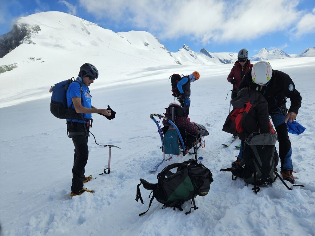 S pomočjo srčnih prostovoljcev, ki so jih spremljali in jim pomagali potiskati vozičke preko ledenika, so se povzpeli vse do 3.900 metrov visoko. Pred tem so na vozičke namestili smuči, kar je bila prava inovacija! Tudi ekipa iz našega Športnega društva Preddvor je spremljala in skrbela za njihovo varno smuko do postaje kabinske žičnice na nadmorski višini 3.883 metrov. Pred nami se je razprostirala čudovita pokrajina, ki je vzbujala občutek svobode in pustolovščine, hkrati pa smo se zavedali, kako pomembno je imeti ob sebi podporo in ekipo, ki poskrbi, da je vsak trenutek varen in poln užitka.
