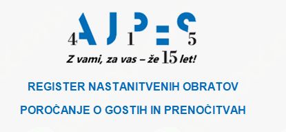 Zavezanci morate obstoječe nastanitvene obrate vpisati v register (RNO) najkasneje do 28.2.2018, prek spletne aplikacije na našem portalu ali osebno na izpostavah AJPES. Vpis nastanitvenega obrata v RNO je pogoj za poročanje podatkov o gostih in prenočitvah v spletno aplikacijo eTurizem oziroma spletni servis. Več na http://bit.ly/2kcZjaA .