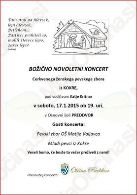 Cerkveni ženski pevski zbor iz Kokre, pod vodstvom Katje Križnar, vas vabi v soboto, 17. januarja 2015, ob 19. uri na Božično novoletni koncert, ki bo v OŠ Matije Valjavca v Preddvoru. Na koncertu bodo nastopili še Pevski zbor OŠ Matije Valjavca in mladi pevci in Kokre. Pokrovitelj koncerta je Občina Preddvor.