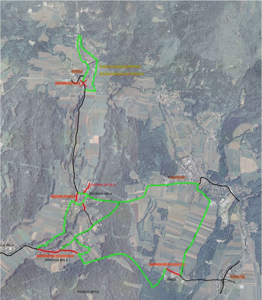 Obvoz za Kranj iz smeri Bašlja in Zg. Bele ter Preddvora bo mogoč po cesti mimo h.št. 63 (Draksler Marija), mimo h.št.10/a (Perko Miran) čez dvorišče Gostilne Bizjak ali mimo h.št.11 (Cerkovnik Florjan) na Sr. Belo.