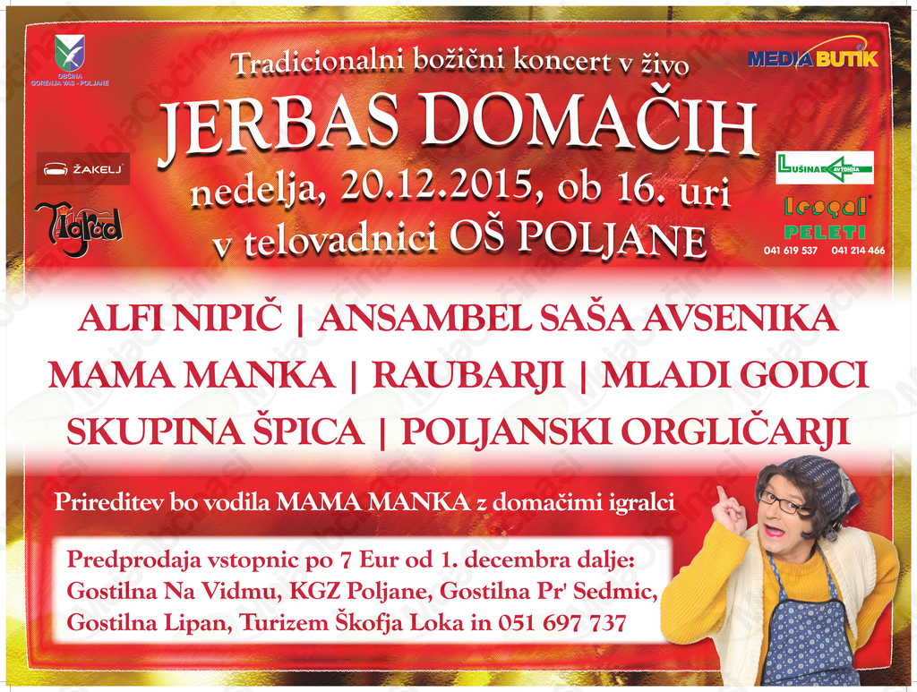 Agencija Media butik iz Preddvora že osmo leto zapored v sodelovanju z Občino Gorenja vas-Poljane pripravlja božični koncert Jerbas domačih.
