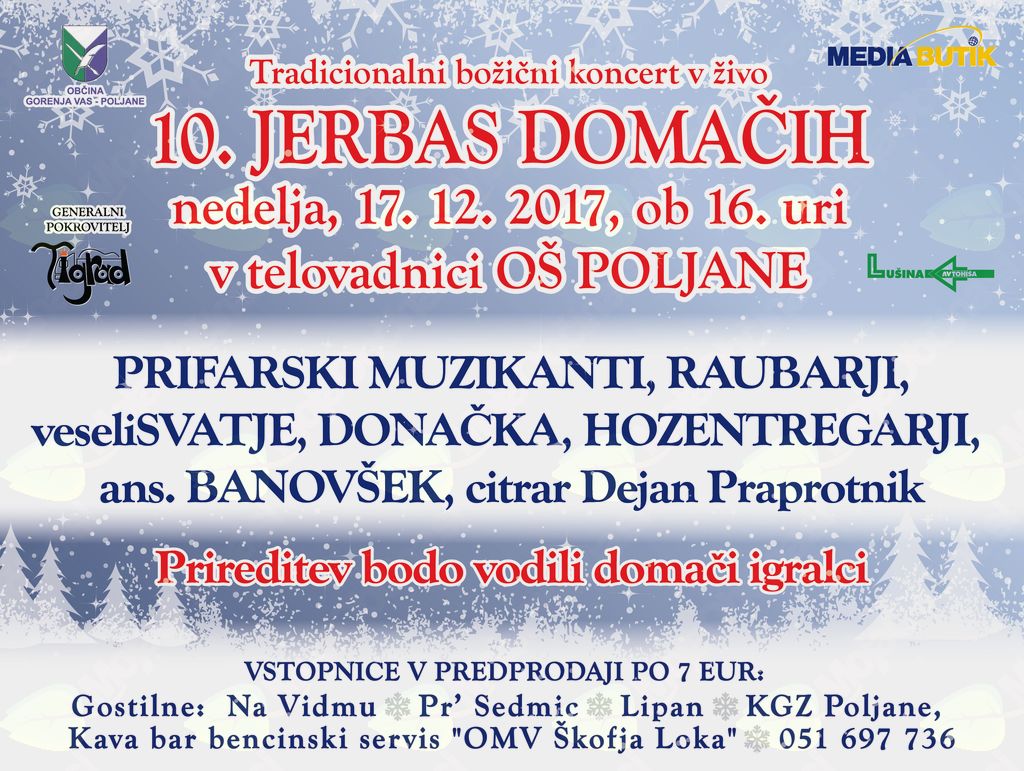 V sodelovanju z Občino Gorenja vas - Poljane pripravljamo že 10. božično novoletni koncert JERBAS DOMAČIH, ki bo prihodnjo nedeljo, 17. decembra 2017, ob 16. uri v telovadnici OŠ Poljane nad Škofjo Loko. V Jerbas domačih vsako leto položimo slovenske pesmi priljubljenih narodno-zabavnih ansamblov, v povezovalnem delu pa je slišati narečno, poljansko govorico. Za glasbeni del bodo tokrat poskrbeli Donačka, veseliSVATJE, Raubarji, ans. Banovšek, Hozentregarji, citrar Dejan Praprotnik in osrednji gostje Prifarski muzikanti. Rdeča nit Jerbasa domačih bo "Cvetje v jeseni", saj prav letos praznujemo 100. letnico od nastanka znamenite povesti dr. Ivana Tavčarja. Vstopnice po 7 evrov so že v predprodaji v gostilnah Na Vidmu v Poljanah, Pr'Sedmic v Gorenji vasi in Lipan na Hotavljah, v Kmetijski zadrugi Poljane in v cafe baru BS OMV v Škofji Loki.