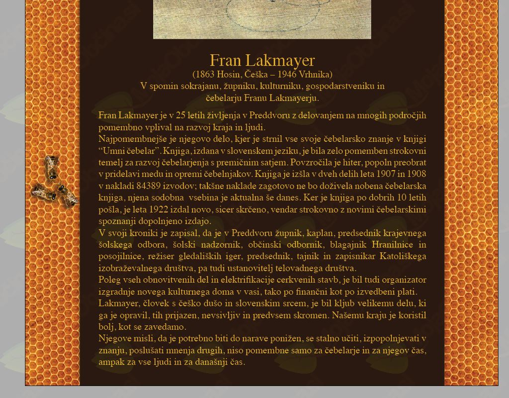 Življenje in delovanje svojega vzornika Frana Lakmayerja bodo preddvorski čebelarji vsem ljubiteljem čebelarstva, občanom in ostalim zainteresiranim predstavili uro pred odkritjem spomenika, torej ob 17.00, v prostorih TICa. Ob 19.00 pa bo v šotoru na grajskem dvorišču veselica z ansamblom Gorenjski kvintet.