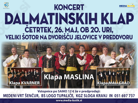 V četrtek zvečer vas vabimo na koncert dalmatinskih klap. V goste smo povabili klape MASLINA iz Šibenika, KVARNER iz Bakra in MALI GRAD iz Kamnika. V šotoru bo koncertna postavitev stolov, vstopnice pa bodo v predprodaji od 4. maja naprej v KGZ Sloga Kranj, v Medenem vrtu v Šenčurju, na Bencinski črpalki LOGO v Tupaličah in na telefonski številki 051/697-737. Cena vstopnice v predprodaji je 12 evrov, na dan koncerta bo 15 evrov.