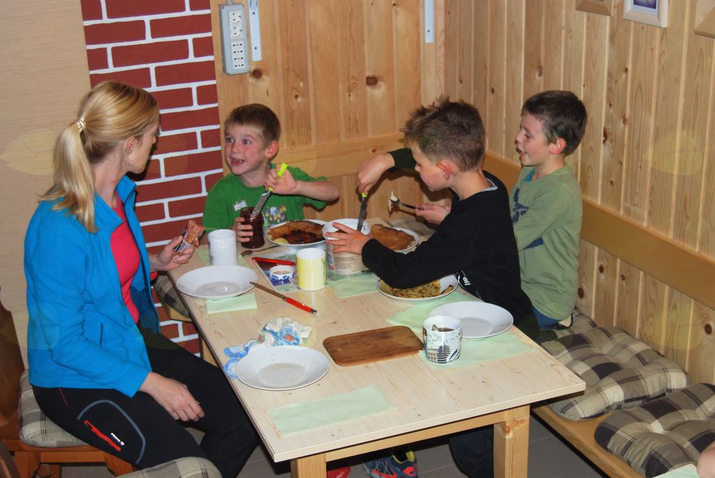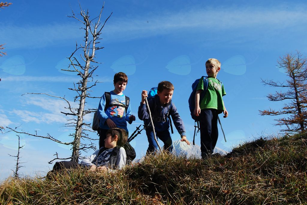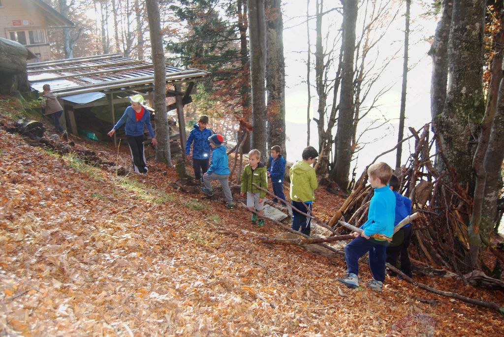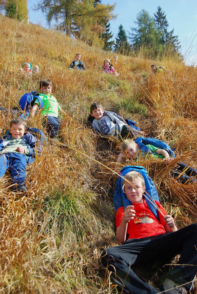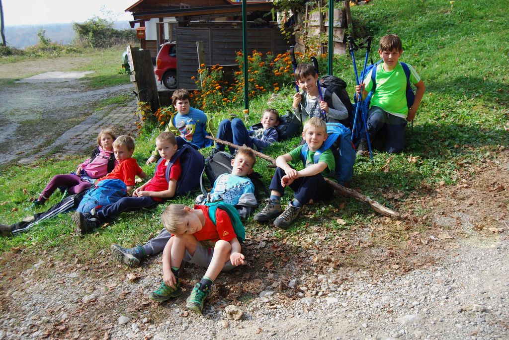 V soboto smo dan začeli ob 7h zjutraj. Brez da bi kdo koga budil ali vlekel na plano, so se otroci oblekli in si zorganizirali skupno dejavnost: vseh 10 je še pred zajtrkom, pa tudi po njem, zavzeto gradilo svoje zavetišče iz vej, listja in mahu. Kar težko je bilo vse skupaj zaključiti in se nekaj minut čez 10 posloviti od Rajka in Hudičevega boršta. Krenili smo čez vzhodno pobočje in naprej po grebenu do Javorovega vrha, kjer so nekateri odkrili radosti dričanja po suhi travi. Prav to veselje je bilo razlog več, da smo se potem vzpeli še na Potoško goro in dodobra izkoristili tamkajšnji naravni tobogan. Kratek postanek in pogled nazaj proti Zaplati z razgledne točke, pa sestop na Jakoba. Kljub temu, da so bile noge že kar malo težke, smo dobre volje, ponosni in zadovoljni s prehojeno potjo ob pol treh prispeli v dolino.