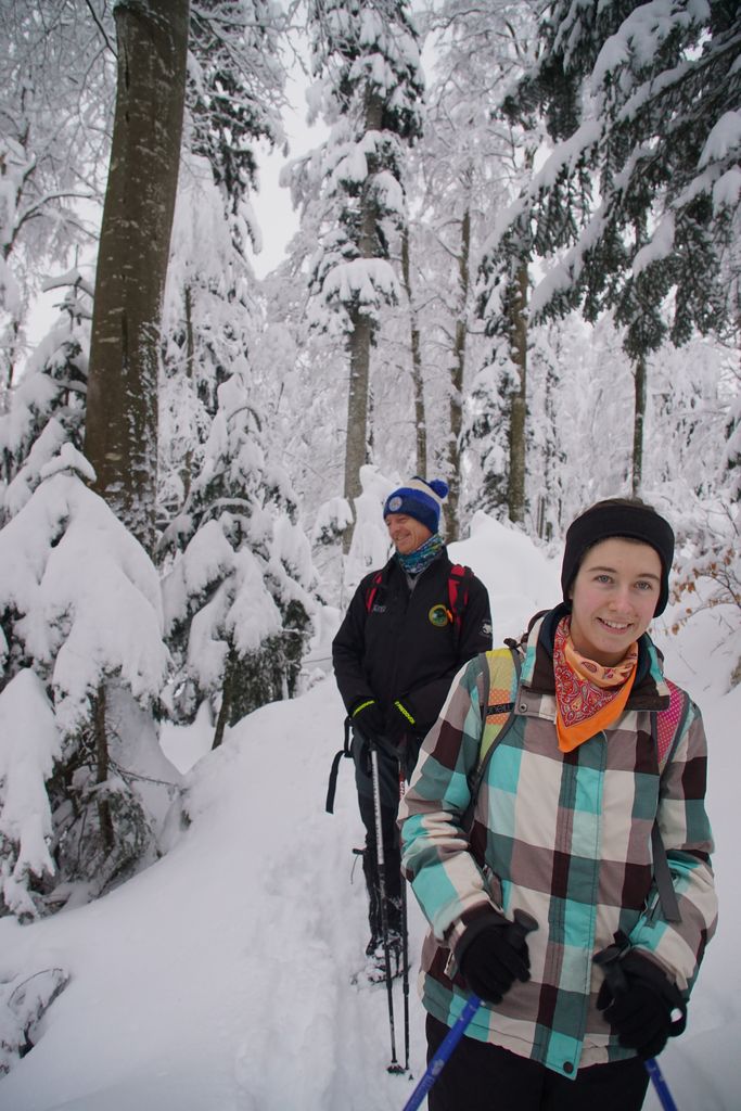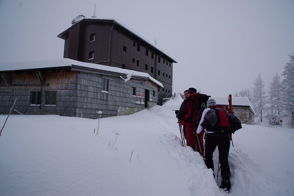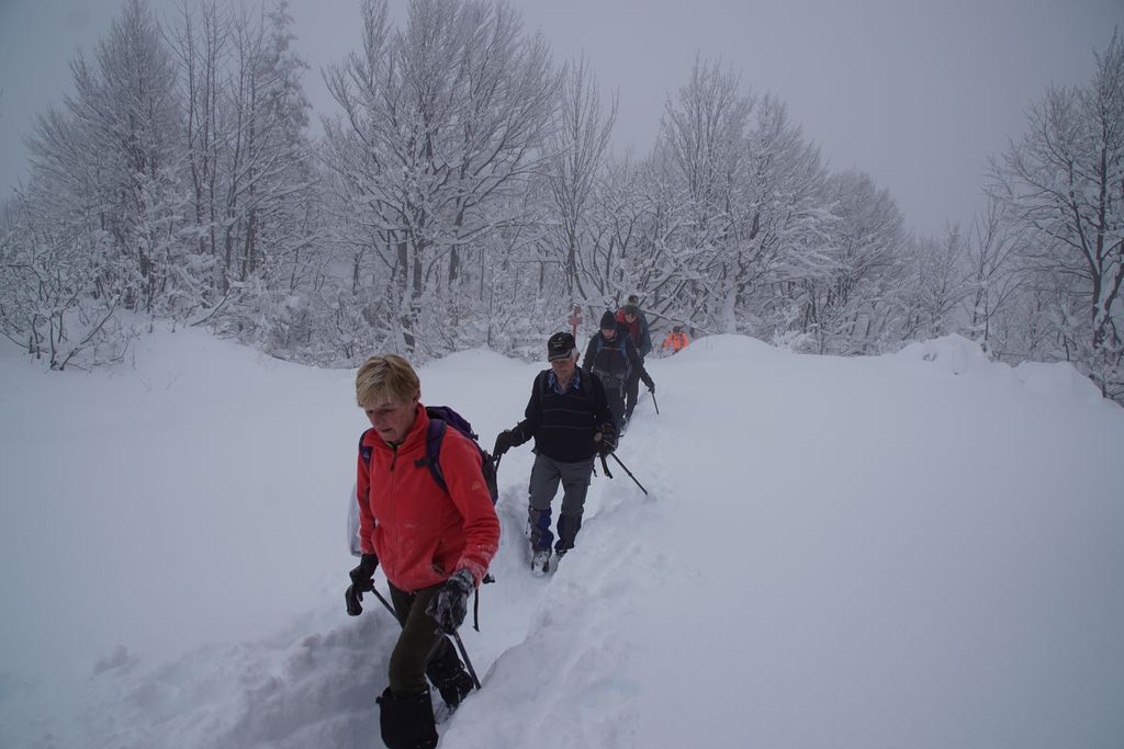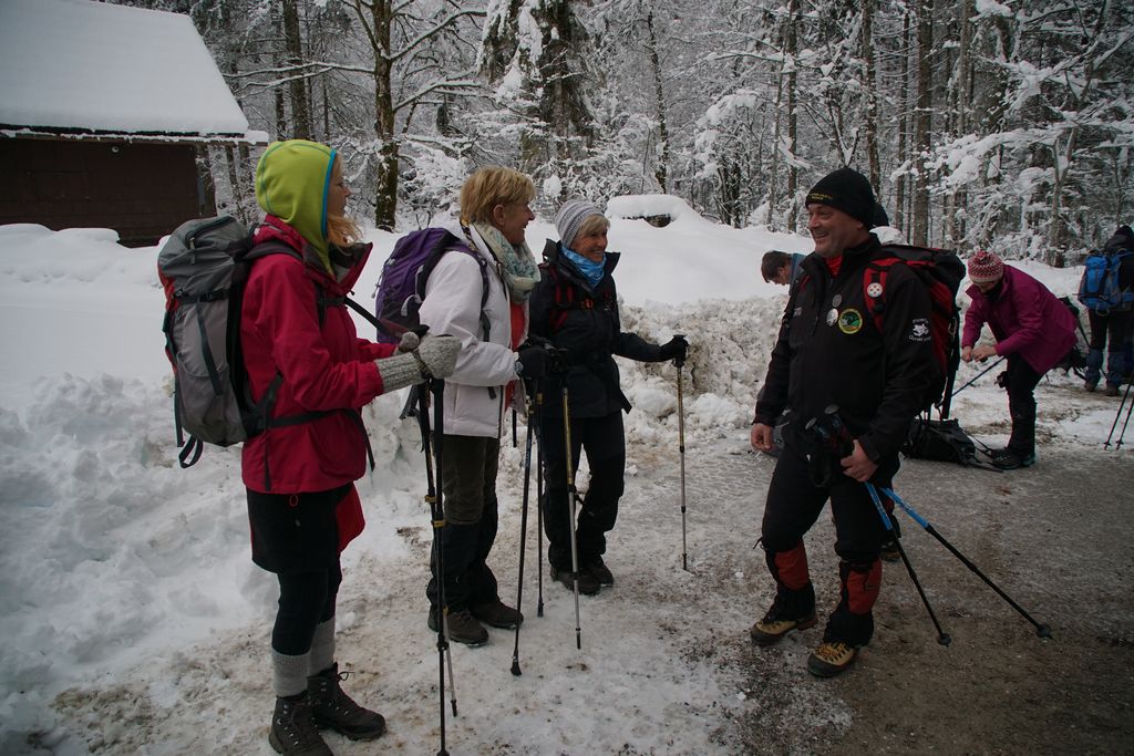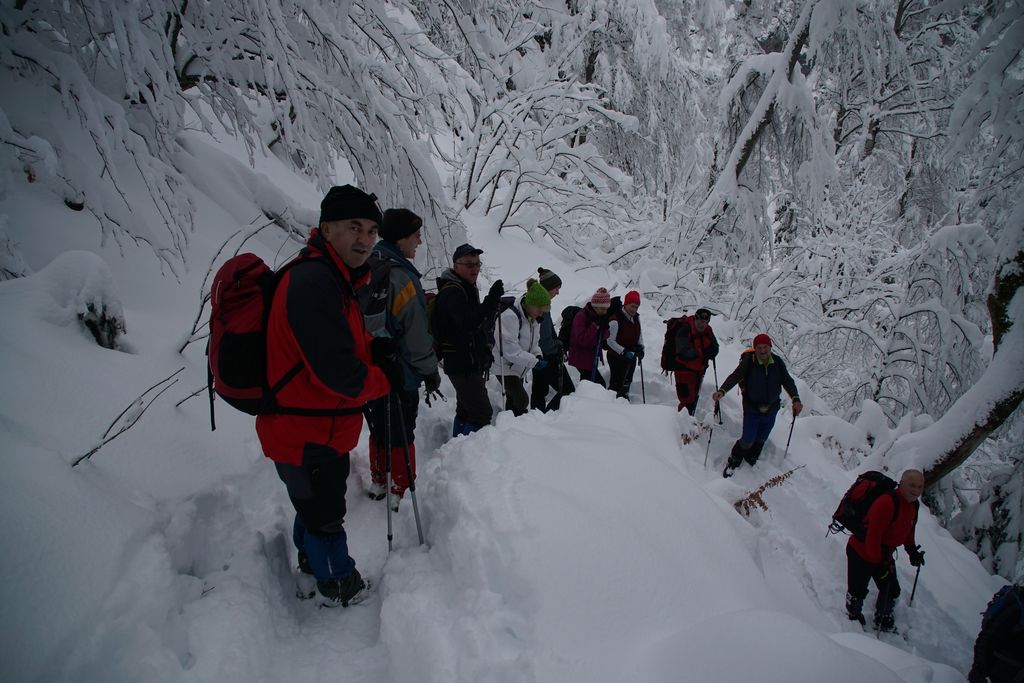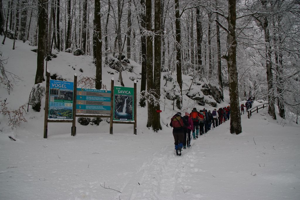 Planinski pohod je vodil predsednik PD Preddvor in gorski vodnik Aleš Drekonja. Ob sedmih zjutraj se nas je 24 članov društva z avtobusom odpeljalo proti Bohinju. Po osvežitvi z jutranjo kavico na OMV-ejevi bencinski postaji pred Radovljico, smo ob pol desetih startali izpred Koče pri Savici na nadmorski višini 653 metrov. Še preje smo se primerno obuli v gamaše, saj je že na izhodišču bilo več snega kot v Preddvoru. Navdušeni nad novozapadlim snegom smo začeli s hojo, ki se je že takoj po odcepu k slapu Savica začela strmo vzpenjati po serpentinasti poti, imenovani tudi »mulatjeri«. Tokrat smo seveda hodili drug za drugim, saj smo gazili sneg. Sledili smo zavojem na levo in desno, Aleš in prvi pohodniki so s poti odstranili marsikatero vejo, ki jo je podrl sneg, Vsi smo tudi upali, da zadnjo 48. serpentino čim preje dosežemo. Zaradi obilice snega je bila pot naporna in naša razpotegnjena kolona se je večkrat ustavila, da smo bili spet vsi skupaj, kot se za planinske pohode spodobi. Pa tudi zaradi številnih duhovitosti besedno navdahnjenih planincev, ki nas razveseljevali. Prav tako smo uživali ob pogledu na Bohinjsko jezero pod seboj in na modro-lesketajoče se snežene luknje v snegu. Neverjetno čudovita je bila to soboto igra narave – na mestu vboda palice v sneg je nastala luknja, ne umazana kot v dolini, ampak je odsevala modro-turkizno barvo. Res čudoviti dar narave. Ob pogledu v nebo nismo videli sonca, smo pa se radostili ob pogledih na s snegom zapadlih vejah dreves. Še nekaj strmine in zagledali smo Dom na Komni na višini 1520 metrov. Po treh urah in pol hoje smo dosegli cilj pohoda.
