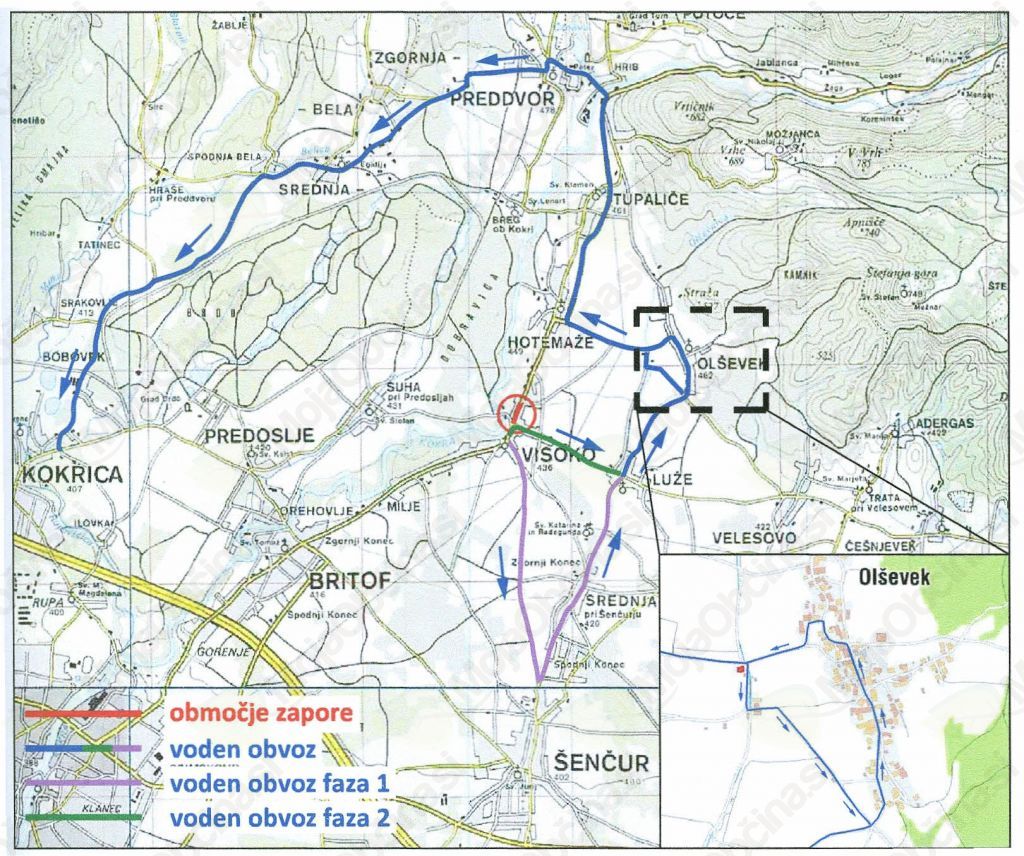 Obvoz v smeri Preddvora bo voden preko Luž in Olševka, iz Preddvora proti Kranju pa preko Srednje Bele.