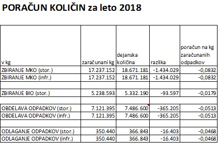 Pri storitvah na področju javne službe ravnanja s komunalnimi odpadki je bila na osnovi ocenjene količine, v letu 2018 uporabnikom obračunana manjša količina, kot je znašala dejansko ugotovljena ob koncu leta. Skladno z republiško Uredbo o metodologiji za oblikovanje cen storitev obveznih občinskih gospodarskih javnih služb varstva okolja, je potrebno uporabnikom zaračunati celotno letno zbrano količino njihovih odpadkov. V letu 2018 smo ugotovili večjo količino pobranih odpadkov, kot v preteklih letih, kar je med drugim tudi posledica večje potrošnje in menjave različnih izdelkov v gospodinjstvih (večja količina kosovnih odpadkov).