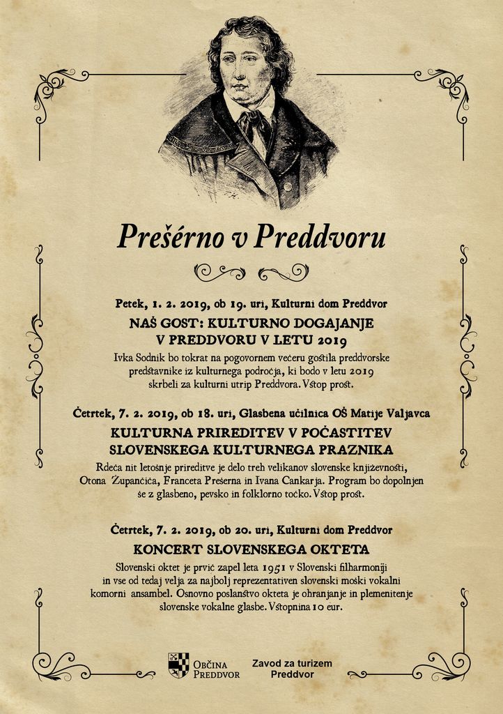Na predvečer Prešernovega dne, v četrtek, 7. 2. , ob 18. uri bo v glasbeni učilnici Osnovne šole Matije Valjavca v Preddvoru tradicionalna kulturna prireditev v počastitev slovenskega kulturnega praznika. Učenci bodo nastopili z recitacijami del Otona Župančiča, Franceta Prešerna in Ivana Cankarja, uprizorili bodo Prešernov Krst pri Savici, nadarjeni glasbeniki bodo zaigrali na klavir, prečno flavto in evfonij, z venčkom ljudskih in domoljubnih pesmi se bo predstavil Mladinski zbor naše šole, venček ljudskih plesov pa bo odplesala Folklorna skupina Preddvor.