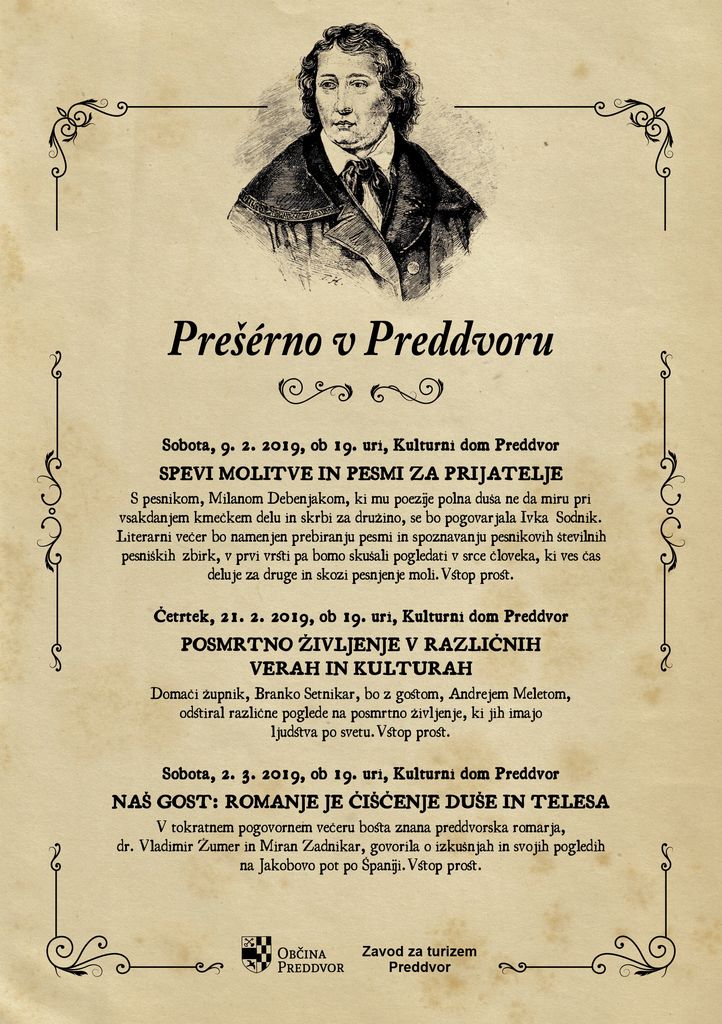 Zadnji v nizu kulturnih dogodkov bo pogovorni večer z naslovom »ROMANJE JE ČIŠČENJE DUŠE IN TELESA«, ki bo v dvorani kulturnega doma v Preddvoru v soboto, 2. marca 2019, ob 19.00. O razlogih za romanje, o težavah in lepih doživetjih na romarskih poteh, se bo Ivka Sodnik pogovarjala z znanima preddvorskima romarjema, dr. Vladimirjem Žumrom in Miranom Zadnikarjem.