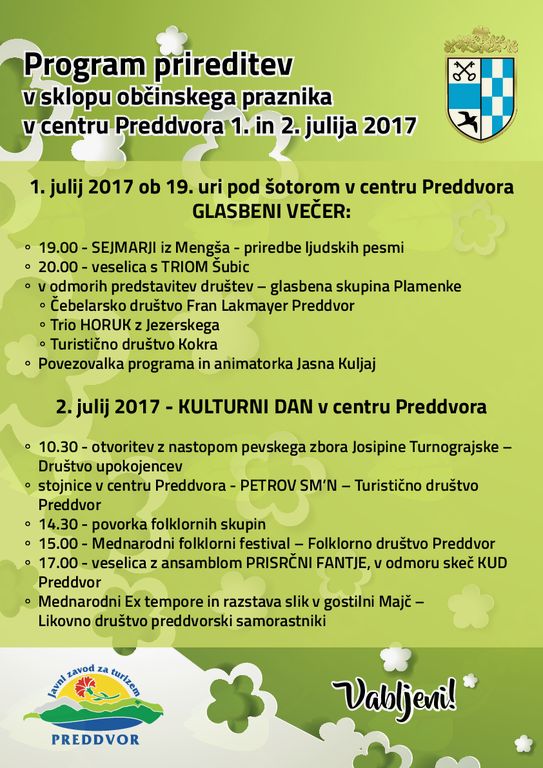 1. julij 2017 ob 19. uri pod šotorom v centru Preddvora GLASBENI VEČER in 2. julij 2017 - KULTURNI DAN v centru Preddvora.