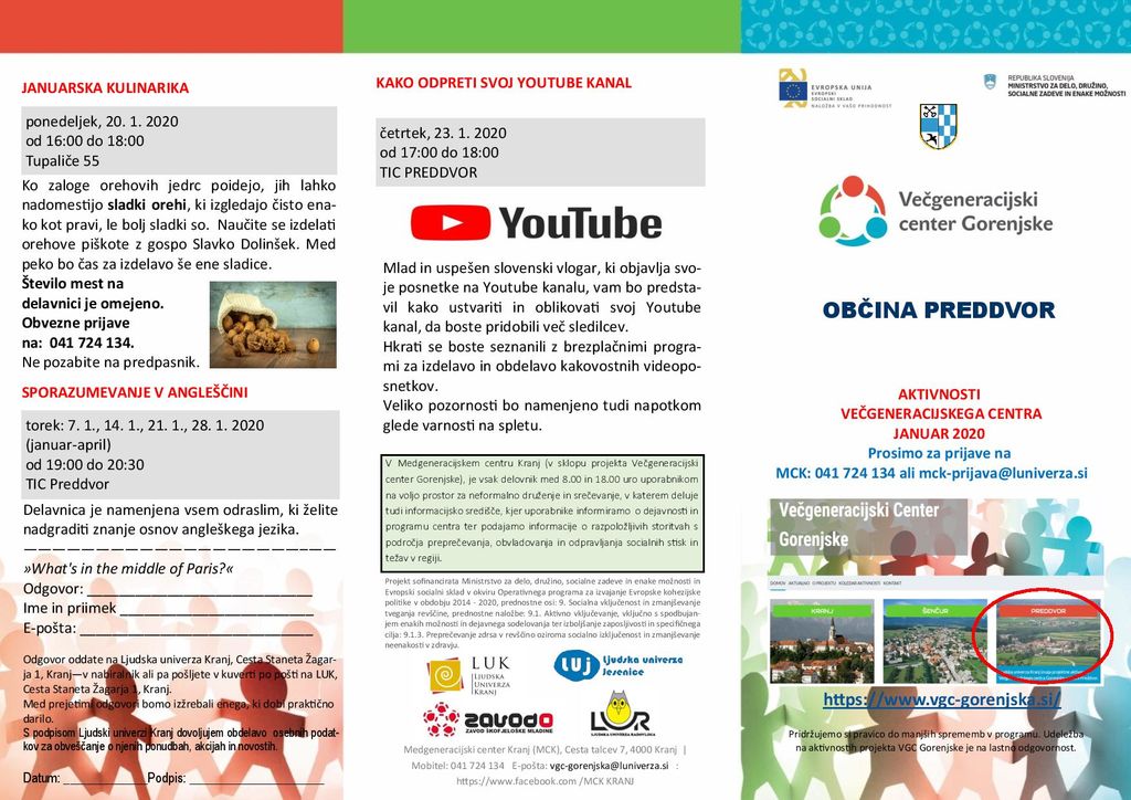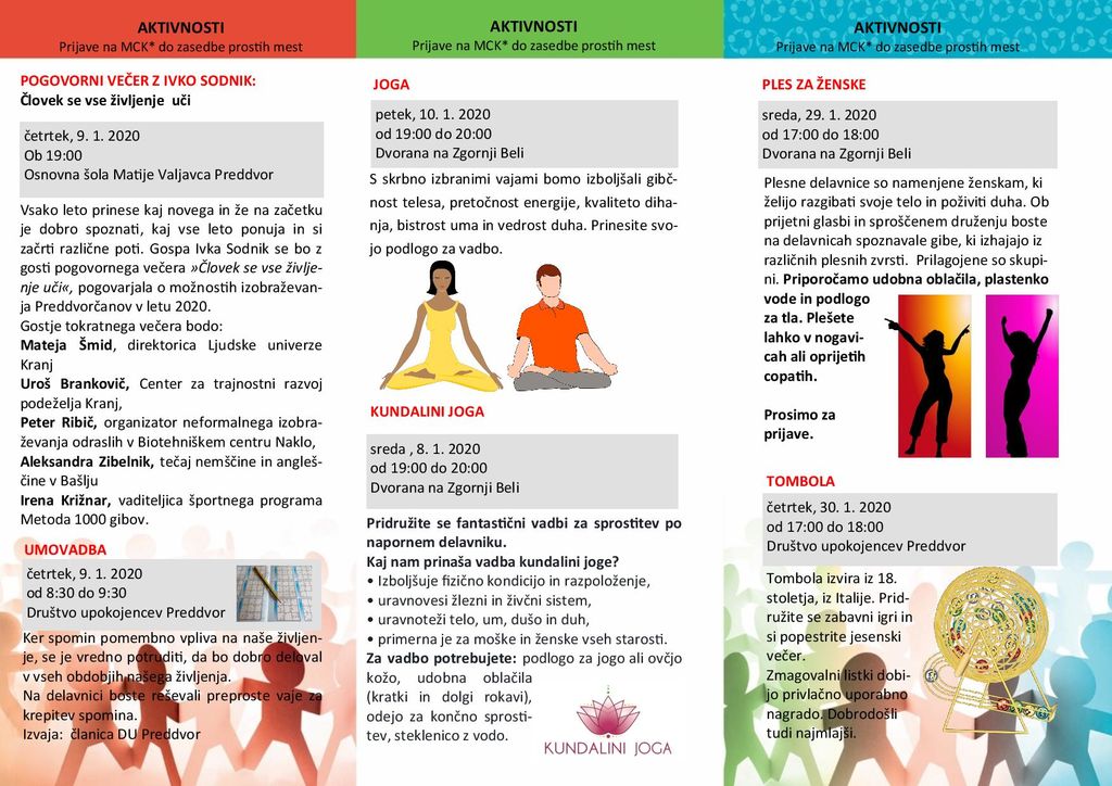 Večgeneracijski center Gorenjske je tudi za januar 2020 pripravil več brezplačnih aktivnosti v Preddvoru.