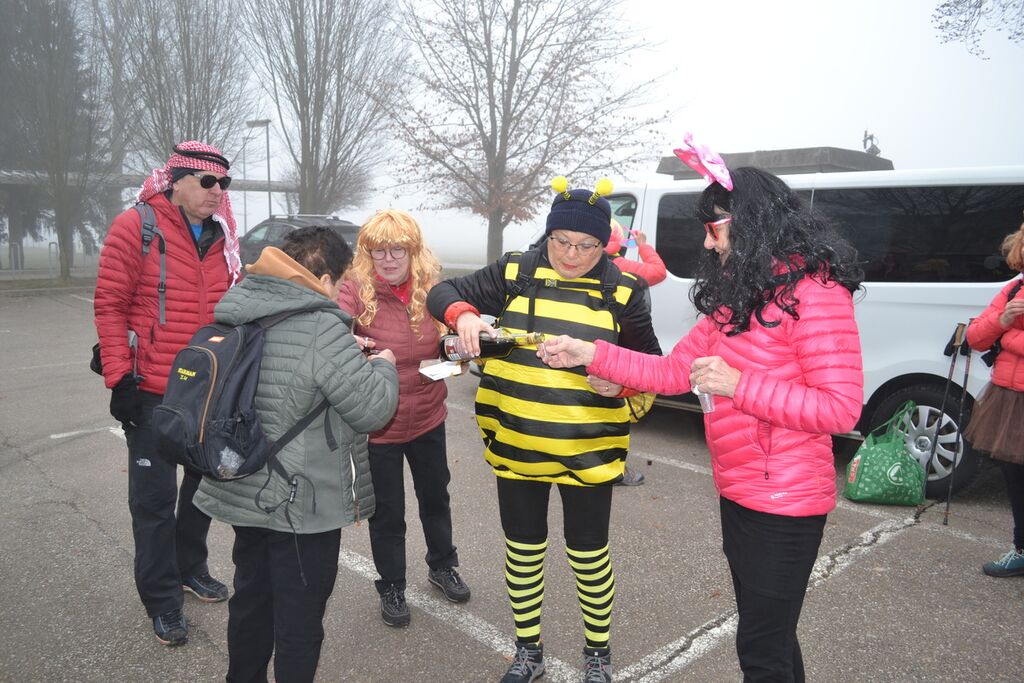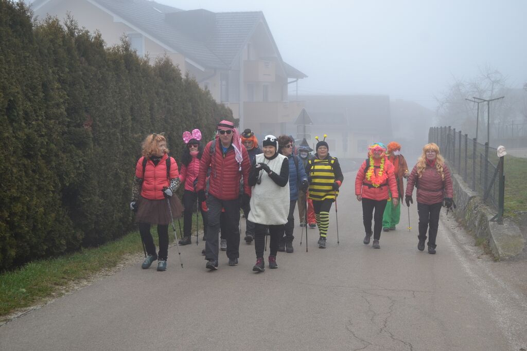 V sončnem, a še v nekoliko zimskem dnevu, smo se našemljeni pohodniki zbrali na zbirnem mestu pred Jelovico v Preddvoru. Po kratki in megleni vožnji smo prispeli do Valburge, kjer je bilo naše izhodišče. Za okrepčilo je poskrbela naša nova članica Marija, da bomo lažje prehodili "strmo pot". Že ob vzponu ni manjkalo šaljivih pripomb in zvončkljanja, ki je oznanjalo, da na vrh prihajajo maškare. Za pravo presenečenje sta poskrbeli naši pohodnici Mimi in Martinka, ki sta nas na vrhu pričakali z domačimi flancati. In še eno veliko presenečenje je sledilo. Naša "noseča ovčka" je tam rodila majhno, ljubko "becko". Privoščili smo si še obvezno kavico in skupinsko fotografiranje.