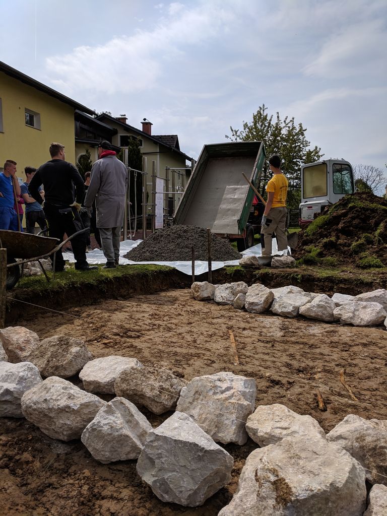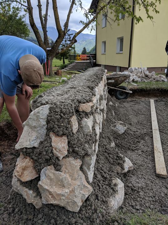 Kamenje smo ročno nabrali v lokalnem kamnolomu. S tem smo zagotovili nabor kamenja pravilnih velikosti, da je bilo mogoče iz njega postaviti zidova. Vseeno pa so bili učitelj in dijaki postavljeni pred izziv, postaviti zidova iz kupa kamenja in betona, brez dodatne obdelave kamenja in brez dodatnih pripomočkov. Povezali so obstoječe znanje, ki so ga imeli z logiko povezovanja materialov in statike ter se ob tem veliko naučili in pridobili dragocene izkušnje. Zidova sta zasnovana in sestavljena iz dveh vrst kamenja, povezanega z betonom in armaturno mrežo, postavljeno med njiju. Beton, kot vezivo, vse skupaj poveže v stabilno celoto. Nalogo so opravili odlično, kar me navdaja s prepričanjem, da bodo odrasli v kvalitetne mojstre, ki jih naša dežela resnično potrebuje.