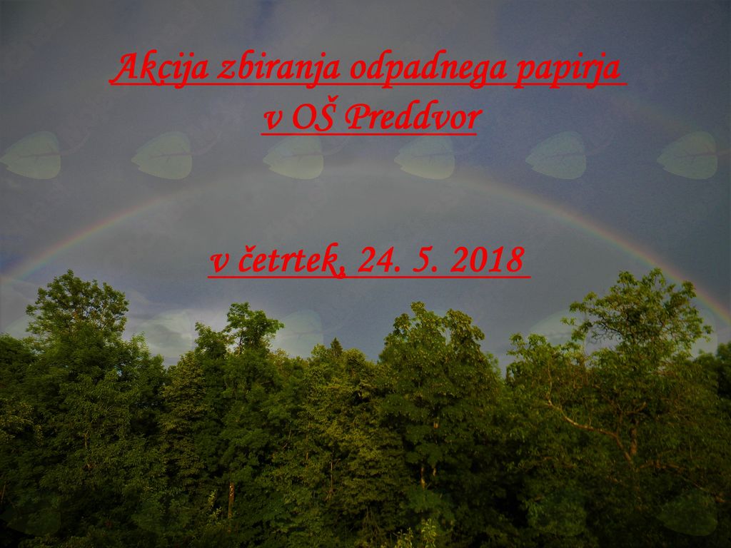 Akcija zbiranja odpadnega papirja v OŠ Matije Valjavca Preddvor bo v četrtek, 24. 5. 2018 od 7.00 do 8.15 in od 12.00 do 16.00, na šolskem parkirišču ob vhodu v 1. triado. Ločeno bomo odlagali karton (manjši zabojnik) in papir (večji zabojnik). Zaželeno je, da je papir zvezan ali v škatlah. Če bo papir stehtan, se rezultati pripišejo razredu, katerega boste navedli ob oddaji papirja. Če boste papir/karton samostojno oddali v zabojnik v sredo ali četrtek po 16. uri ali zjutraj pred 7. uro, količino papirja in razred lahko sporočite po elektronski pošti na naslov bojana.koprivec@guest.arnes.si.