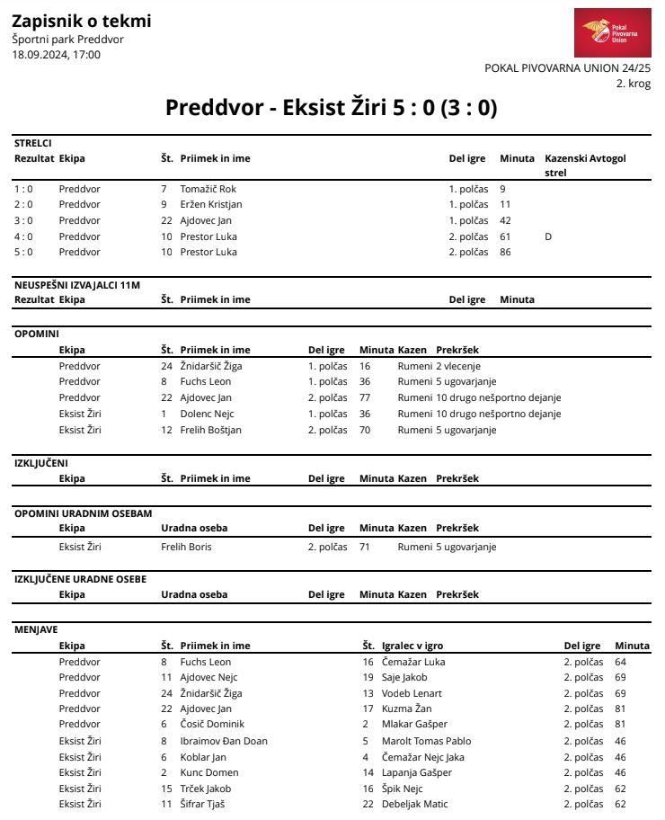 V 2. krogu tekmovanja za Pokal Pivovarna Union se je članska ekipa Preddvora pomerila z ekipo Eksist Žiri, ki sicer nastopa v 3. slovenski ligi.
