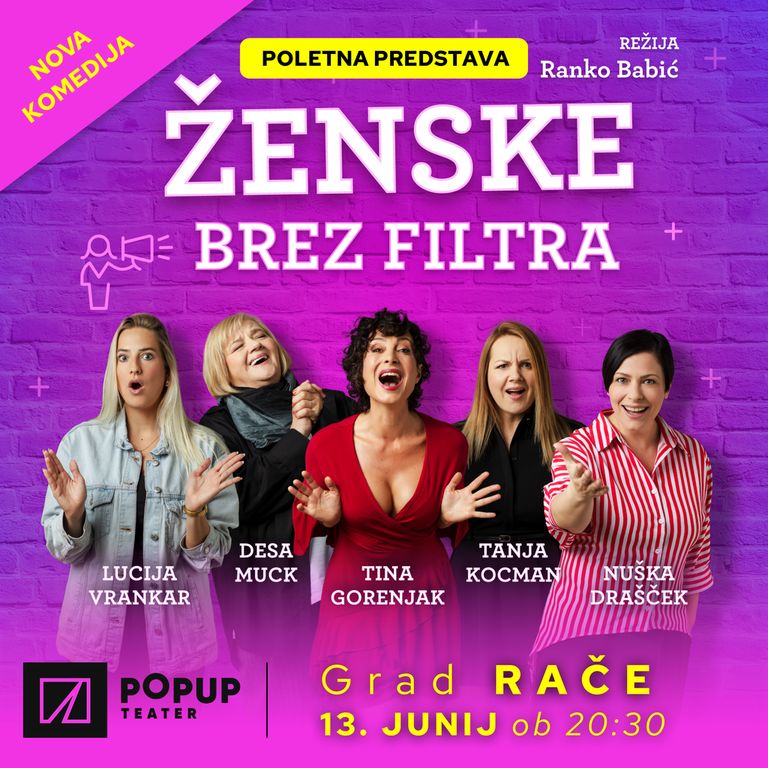 Vsaka od teh 5 žensk prinaša svojo zgodbo in izkušnje, vse pa združuje nefiltriran pogled na današnji svet, ki je pogosto prekrit s filtri. Na odru vas bo teh 5 žensk s vpogledom v svoje življenje in razmišljanje zagotovo nasmejalo do solz, filtre pa bodo prihranile za Instagram.