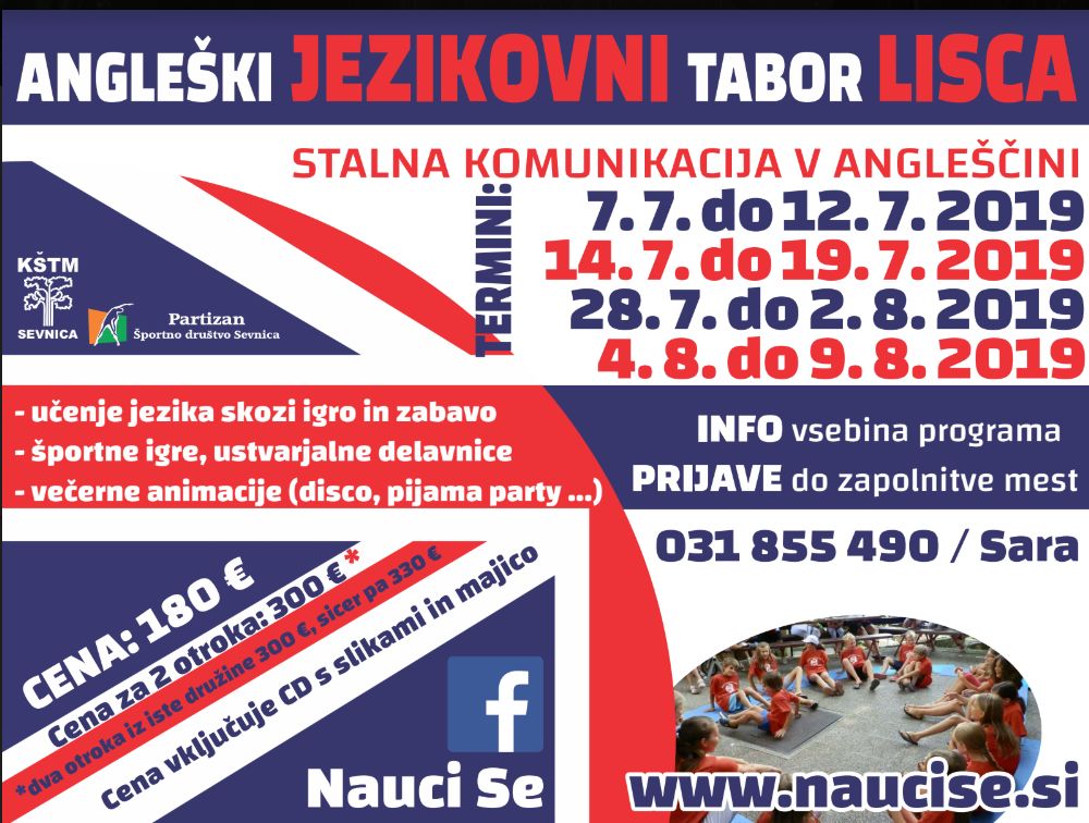 Sedmo leto zapored se bodo otroci v poletnih mesecih udeležili Angleškega tabora na Lisci v organizaciji ŠD Partizana Sevnica in zavoda KŠTM Sevnica.