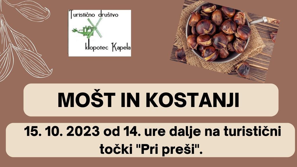 TD Klopotec Kapela bo v nedeljo 15.oktobra od 14.ure dalje na turistični točki "pri preši" organiziralo prireditev MOŠT IN KOSTANJI.
