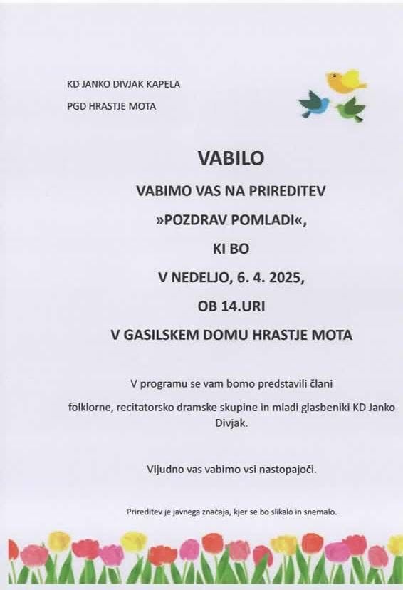 Kulturno društvo Janko Divjak Kapela, Vas vabi na že tradicionalno prireditev "Pozdrav pomladi", ki se bo odvijala v nedeljo, 6.4.2025 ob 14.00 uri, v gasilskem domu Hrastje Mota. Predstavili se bodo folklorniki, otroška folklorna skupina, mladi recitatorji, dramska sekcija in gosti.