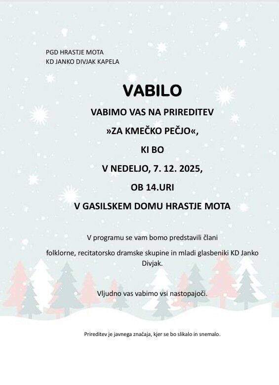 Leto je naokoli in KD Janko Divjak Kapela vas spet vabi na našo že tradicionalno zimsko prireditev " Za kmečko pečjo", ki se bo odvijala v nedeljo 7. 12. 2025 ob 14. uri, v gasilskem domu v Hrastje Moti. Predstavili se bodo člani iz folklorne, dramsko- recitatorske sekcije in sekcije mladih glasbenikov, ter povabljeni gostje. Lepo vas vabimo, da z nami preživite lepo popoldne ob prijetni glasbi, plesu in smehu.