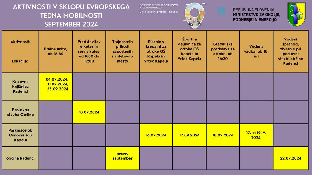 - Odprtje Evropskega tedna mobilnosti: Dogodke bomo otvorili na parkirišču za Osnovno šolo Kapela, kjer bomo za naše najmlajše pripravili animacijski program. Vabljeni, da se nam pridružite v veseli družbi.